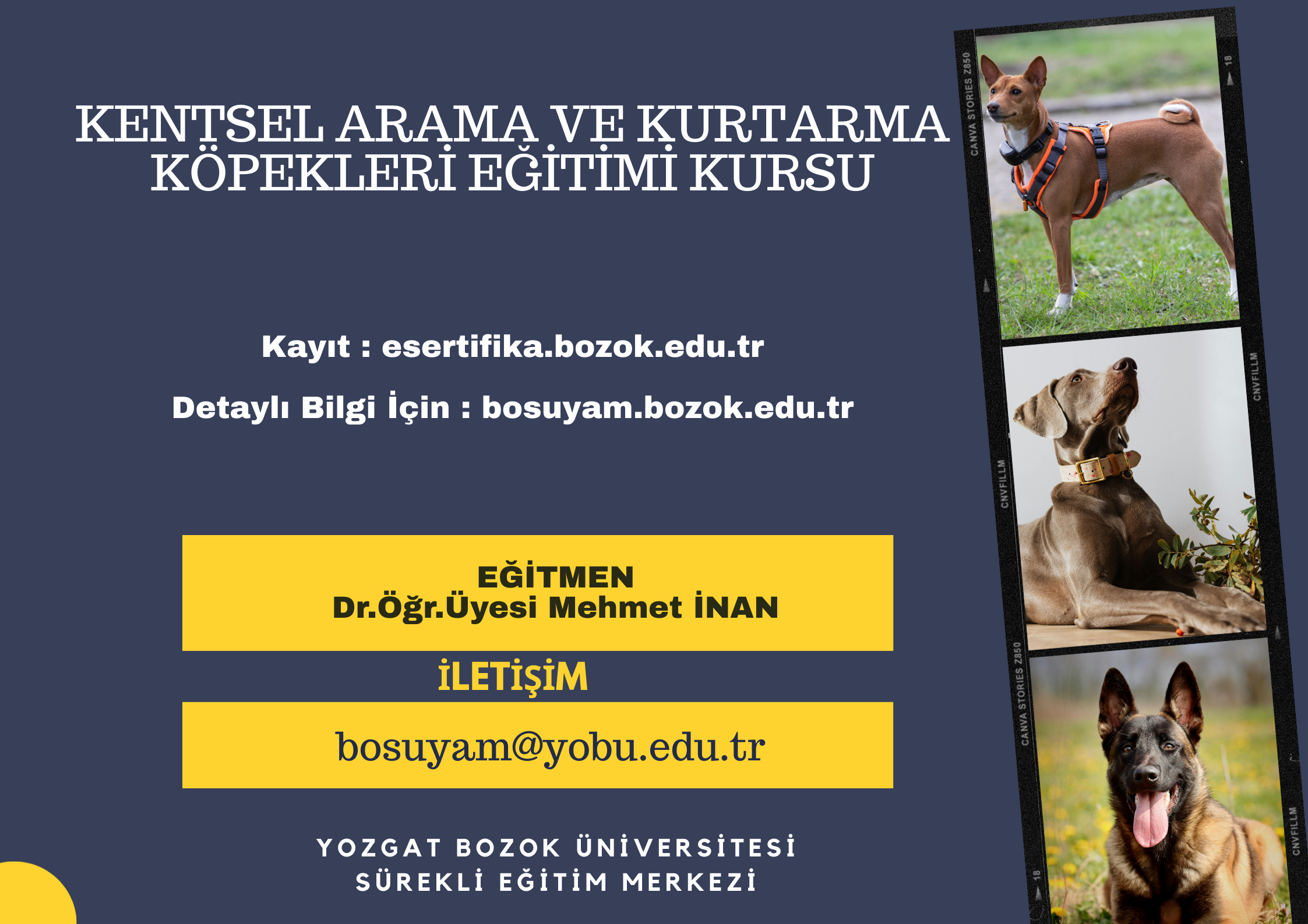 Bu kurs; kentsel afet ve acil durumlarda görev alacak arama kurtarma köpeklerinin seçimi, eğitimi, sevk ve idaresi, operasyonel kullanımı ile etik ve güvenlik temelli uygulamalar konusunda katılımcılara kuramsal ve uygulamalı bilgi ve beceri kazandırmayı amaçlamaktadır.
